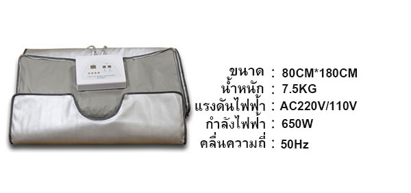 ใช้ในการลดน้ำหนักอบตัวสำหรับร้านสปาโดยเฉพาะ รุ่น ที่ทางร้านนำเข้ามาจะเป็นรุ่นผ้าหนา อย่างดีได้มาตรฐาน ใช้สำหรับการอบตัวลดน้ำหนัก ช่วยให้เลือดไหลเวียนดี ขับสารพิษในร่างกาย ได้ทั้งสุขภาพและหุ่นสวย รุ่น ซิปรอบด้าน ไซด์ใหญ่ 75 ซม. X 175 CM . ผ้าห่มให้ความร้อน ด้วยไฟฟ้า เป็นอุปกรณ์มาตรฐานสำหรับสปา และสถานบริการความงามชั้นนำ โดยจะใช้ความร้อนเพื่อกระตุ้นการไหลเวียนโลหิต ภายในร่างกาย สามารถปรับระดับอุณภูมิให้เหมาะสม เพื่อการขยายรูขุมขน ช่วยให้สารที่มีประโยชน์ต่างๆ ซึมเข้าสู่ผิวหนังได้ดีขึ้น หรือใช้อุณหภูมิสูงขึ้น เพื่อช่วยให้มีการขับเหงื่อออกจากร่างกาย จึงเหมาะที่จะใช้ทำทรีทเม้นตัวต่างๆ เช่น ทรีทเม้นสาหร่าย และทรีทเม้นโคลน เป็นต้น เพื่อการบำรุงผิว หรือลดสัดส่วนที่ไ้ด้ผล ปลอกผ้าห่มซีลอย่างดี ด้วยเทคนิคไฮฟรเควนซี ทนต่อการฉีดล้างที่แรงๆ (ควรถอดสายไฟออกก่อน) ผืน ปลอกผ้าห่ม มีความหนาและทนทานต่อการใช้งาน ผลิตจาก PVC ชนิดไม่ติดไฟ ผ่านการบำบัดด้วยระบบ Bio-Broof ซึ่งจะแทรกซึมทั่วทั้งตัวผ้าห่ม ป้องกันการเกิดเชือ้ราและเชื้อโรคต่างๆ ตลอดอายุการใช้งาน